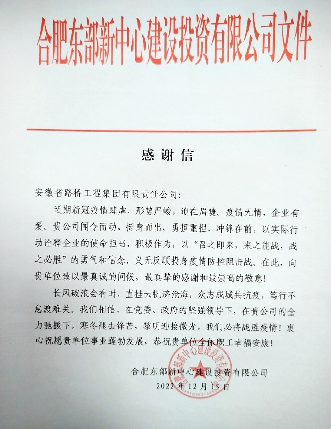 近日,合肥东部新中心建设投资有限公司发来感谢信,对安徽路桥集团在疫情形势严峻复杂的非常阶段,主动担当作为、夜以继日奋战在瑶海区防疫第一线,给予高度的赞扬和衷心感谢。