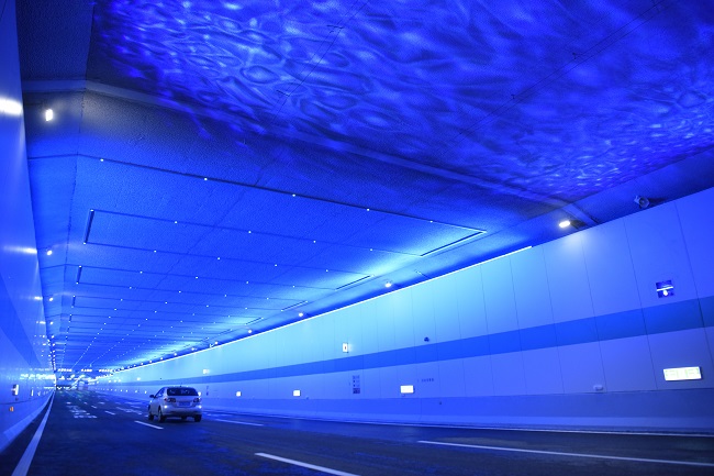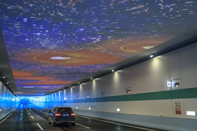 由安徽路桥集团承建的花园大道(徽州大道-包河大道)工程,于2020年12月正式开建。为最大限度减少对骆岗生态公园景观的影响,花园大道项目主要采取下穿方式,在设计复杂程度、工艺难度系数上均刷新全省“纪录”,创下全省市政道路建设史上的“多个首个”。其中花园大道与庐州大道在地下交互,是安徽省首个也是最深的地下互通立交工程,最深处距离地面达26米,花园大道位于地下二层,通过地下互通匝道同庐州大道实现交互。隧道设计了三种不同的灯光模式,距东、西侧隧道出入口分别约30m、100m处,采用投影灯模式,呈现一片流动的“蓝天白云”和“蓝色水流”。隧道顶部约有2000米采用节能LED灯,呈现七色繁星变幻模式,点点灯光像夜空的星星明亮闪烁。此外,隧道中央约有100多米的距离,采用了投影机模式,可根据需要变换不同的内容循环播放。为响应节能减排要求,投影模式不会24小时全天候开启,而将间断投放。
