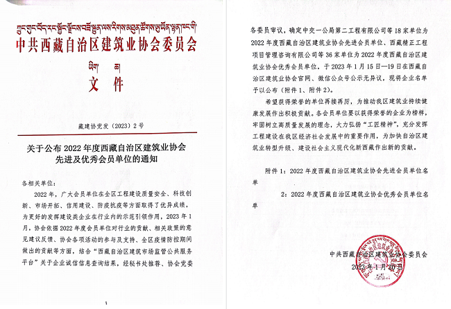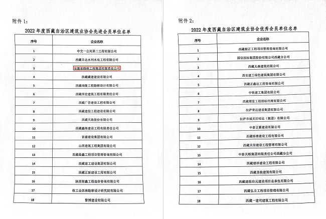 近日,西藏自治区建筑业协会党委通报表彰2022年度先进及优秀会员单位,安徽路桥集团被授予“先进会员单位”荣誉称号,这是公司连续三年获此殊荣。
