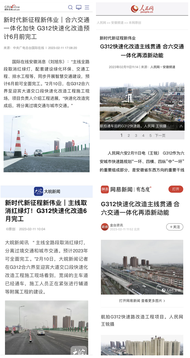 中央广播电视总台安徽总站、光明日报安徽记者站、人民网安徽、安徽日报、安徽广播电视台等中央驻皖新闻单位、省直及市县媒体,重点报道路桥集团“G312快速化改造主线贯通 合六交通一体化再添新功能”。