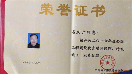 近日,中国施工企业管理协会在厦门召开会议,公布了2016年度“全国优秀施工企业”、“全国工程建设优秀项目经理” 评选结果,我公司荣获2016年度“全国优秀施工企业”,项目经理吕庆广荣获“全国工程建设优秀项目经理”称号。