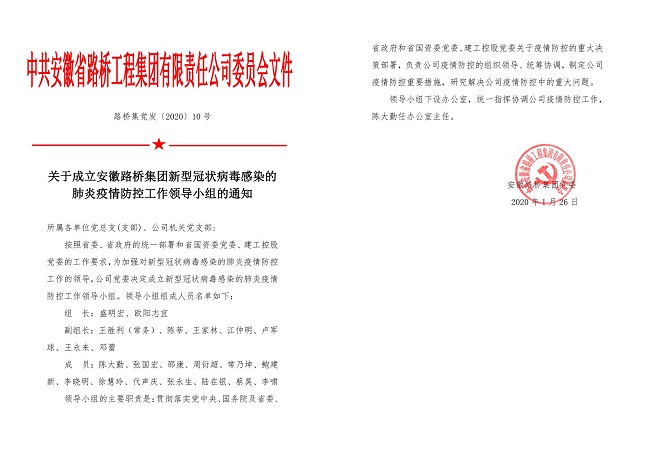 面对突如其来的疫情,路桥集团党员领导干部坚守岗位、靠前指挥。1月26日晚,召开防疫工作动员部署会,下发防控工作《紧急通知》,全面落实防控措施,建立联防联控机制;1月27日,下发延长春节假期值班通知,建立关键部门和岗位人员值班值守机制;截至目前已多次召开了领导小组视频会议,对疫情防控工作进行再研究再部署再动员。