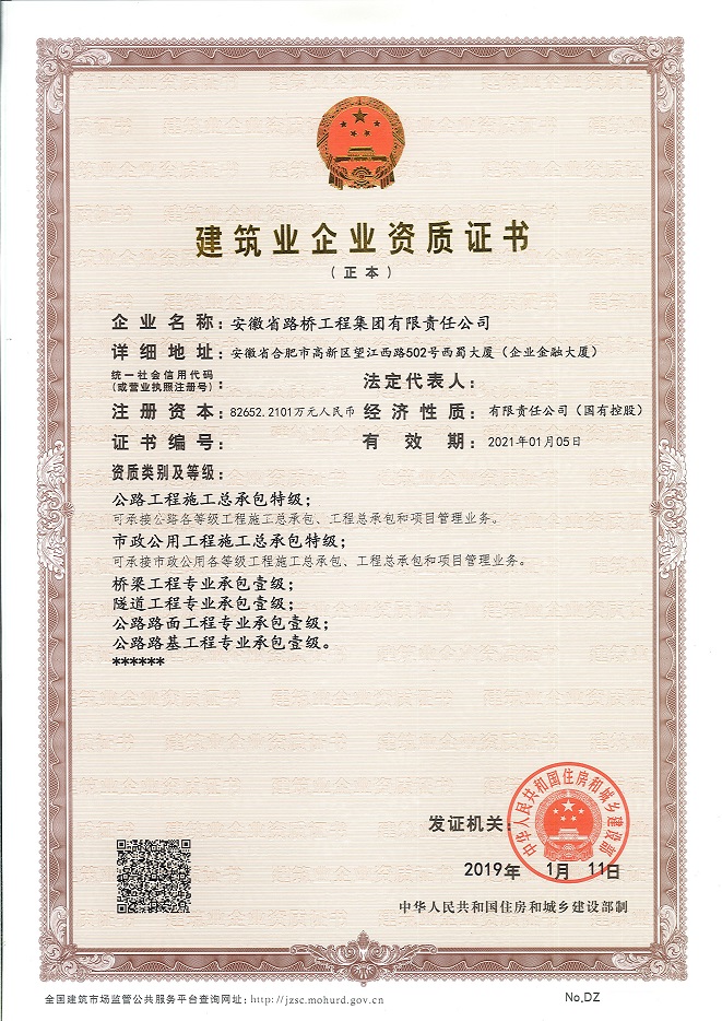 继2017年公司通过市政施工总承包特级、市政设计行业甲级资质后,今年4月,公司又成功取得公路施工总承包特级资质以及公路设计行业甲级资质,成为安徽省内首家拥有市政、公路“双特双甲”资质企业。近期,公司又新增环保一级、起重设备安装一级、地基基础工程一级、港口与航道工程二级、机电工程二级、水利水电工程二级资质。西藏新瑞公司获批水利水电工程三级资质,检测公司资质升甲工作顺利推进,企业资质进一步丰富。
