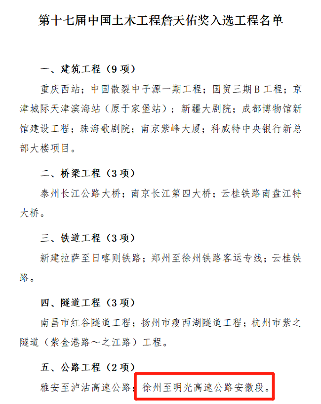 近年来,安徽路桥集团秉承工匠精神,打造精品工程。8月,公司承建的徐州至明光高速公路项目喜获中国土木工程学会“詹天佑奖”公示。中国土木工程詹天佑奖由中国土木工程学会和北京詹天佑土木工程科学技术发展基金会于1999年联合设立,是经国家批准、建设部认定、科技部首批核准的科技奖励项目,已经成为我国土木工程建设领域科技创新的最高奖项。12月,由公司承建的岳西至武汉高速公路安徽段路基09标、路面02标,黄山至祁门高速公路路基05段项目双双荣获公路建设最高质量奖——“李春奖”。
