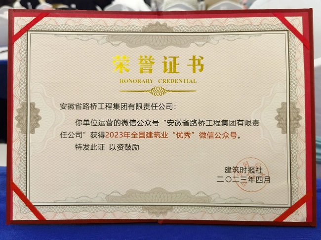 4月20日,2023年建筑业微信公众号运维经验交流研讨会暨全国建筑业优秀公众号颁奖典礼在广西省南宁市召开。连续四年,公司微信公众号“安徽省路桥工程集团有限责任公司”(微信号:ahlqjt)再获“全国建筑业优秀微信公众号”荣誉称号。