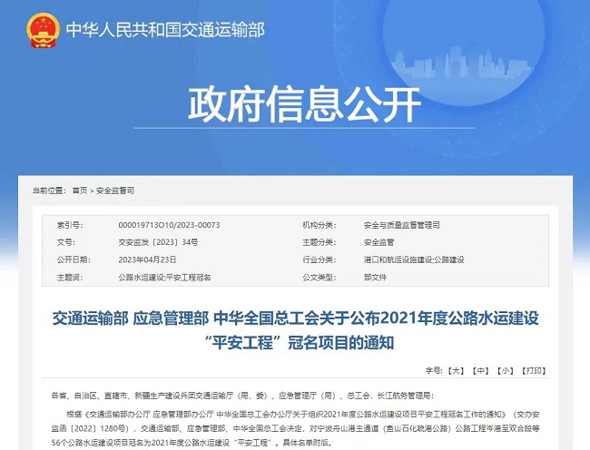 公路水运建设“平安工程”是我国公路水运工程建设领域安全生产管理方面的最高荣誉,号称安全管理领域的“鲁班奖”。冠名项目均为全国各地建设规模大、施工工艺复杂、作业安全风险高、建设成效显著、实现“零死亡”的建设工程。
