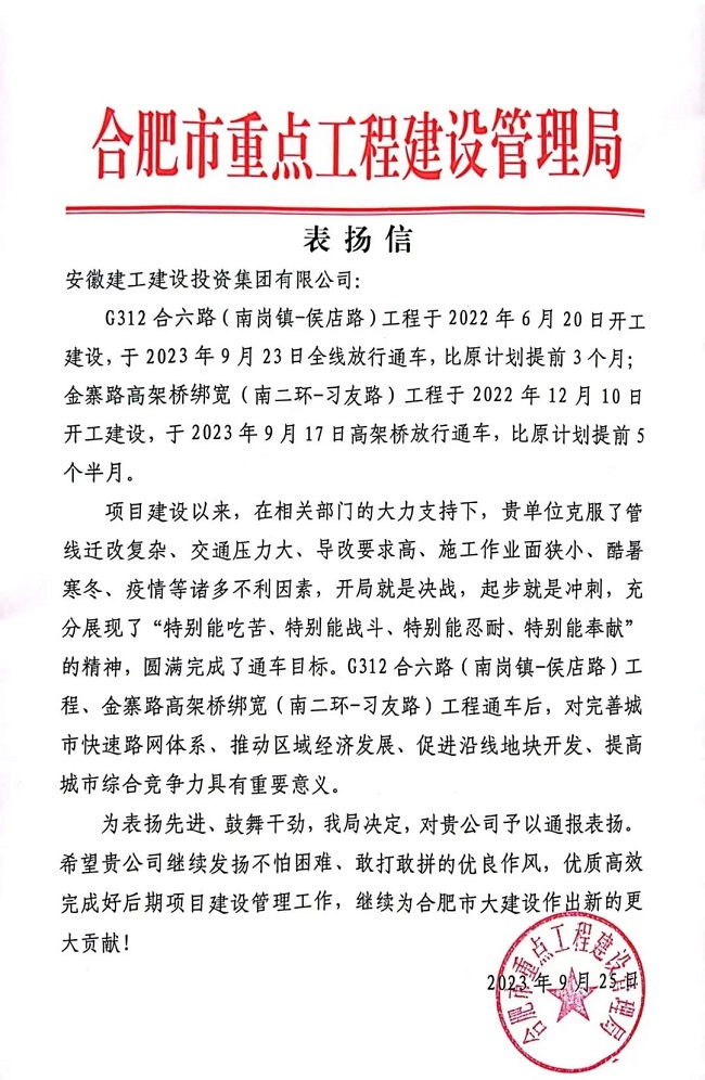 表扬信中指出,G312合六路(南岗镇-侯店路)项目、金寨路高架桥绑宽项目建设以来,在相关部门的大力支持下,克服了管线迁改复杂、交通压力大、导改要求高、施工作业面狭小、酷暑寒冬、疫情等诸多不利因素,以开局就是决战,起步就是冲刺的态度,圆满完成通车目标,充分展现了“特别能吃苦、特别能战斗、特别能忍耐、特别能奉献”的精神。项目圆满通车,对完善城市快速路网体系、推动区域经济发展、促进沿线地块开发、提高城市综合竞争力具有重要意义。同时,合肥市重点局希望建工建投集团能继续发扬不怕困难、敢打敢拼的优良作风,优质高效完成好后期项目建设管理工作,继续为合肥市大建设作出新的更大贡献。