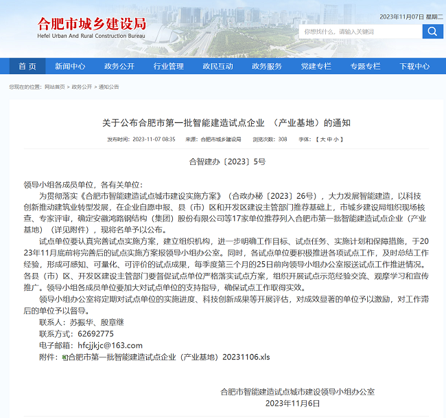 11月7日,合肥市智能建造试点城市建设领导小组办公室公布合肥市第一批智能建造试点企业(产业基地)名单,安徽建工建设投资集团有限公司成功入选!