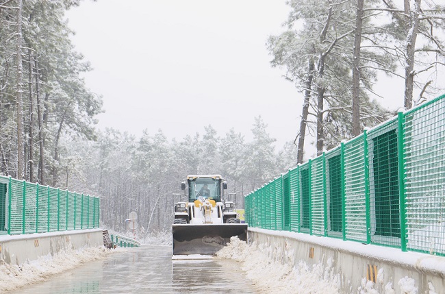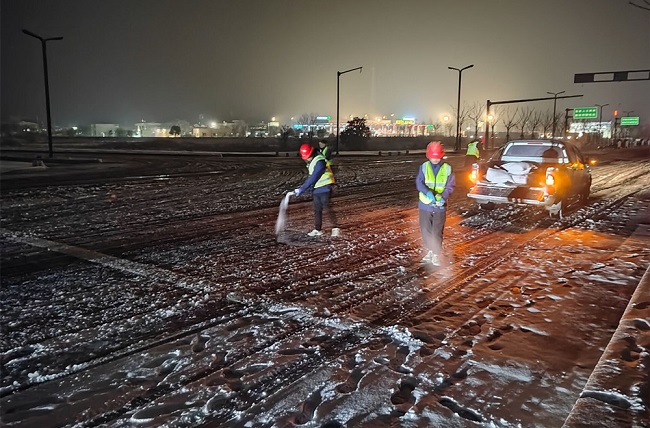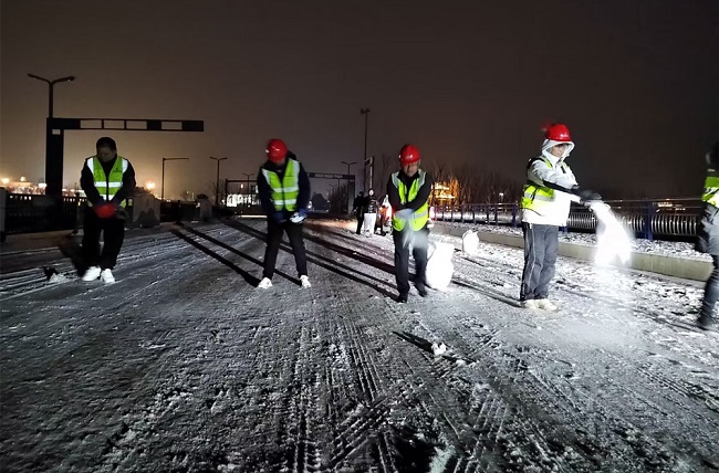 面对寒潮降雪天气,项目部“以雪为令”,迅速启动恶劣天气应急预案,全面开展除积雪工作,全力为群众出行安全、道路畅通保驾护航。通过科学分工,明确任务,管理人员对施工现场、生活区、办公区等进行了全方位检查,尤其是对施工区的钢筋大棚以及各平交路口等重点部位进行了详细的安全排查。项目员工在施工道路改三桥(K8天桥、金梅路跨206天桥、K12天桥)进行了撒盐解冻和积雪铲除等工作,在重点路段加强巡逻管控,引导车辆减速慢行,确保道路总体通畅。