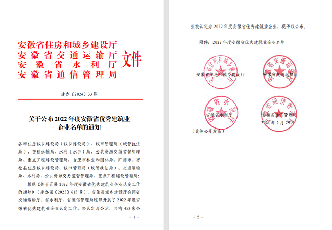 近日,安徽省住房和城乡建设厅发布了“2022年度安徽省优秀建筑业企业”名单,安徽建工建设投资集团有限公司连续三年成功入选,并成为25家综合基础设施总承包类优秀企业之一。
