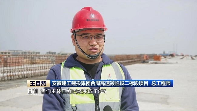 安徽建工建投集团合周高速颍临段二标段项目总工程师 王目然:目前,我们主体工程已经完成了80%,我们标段内包括阜南东互通、陶孜河特大桥以及阜南东服务区等三个控制性工程也已完成了80%。