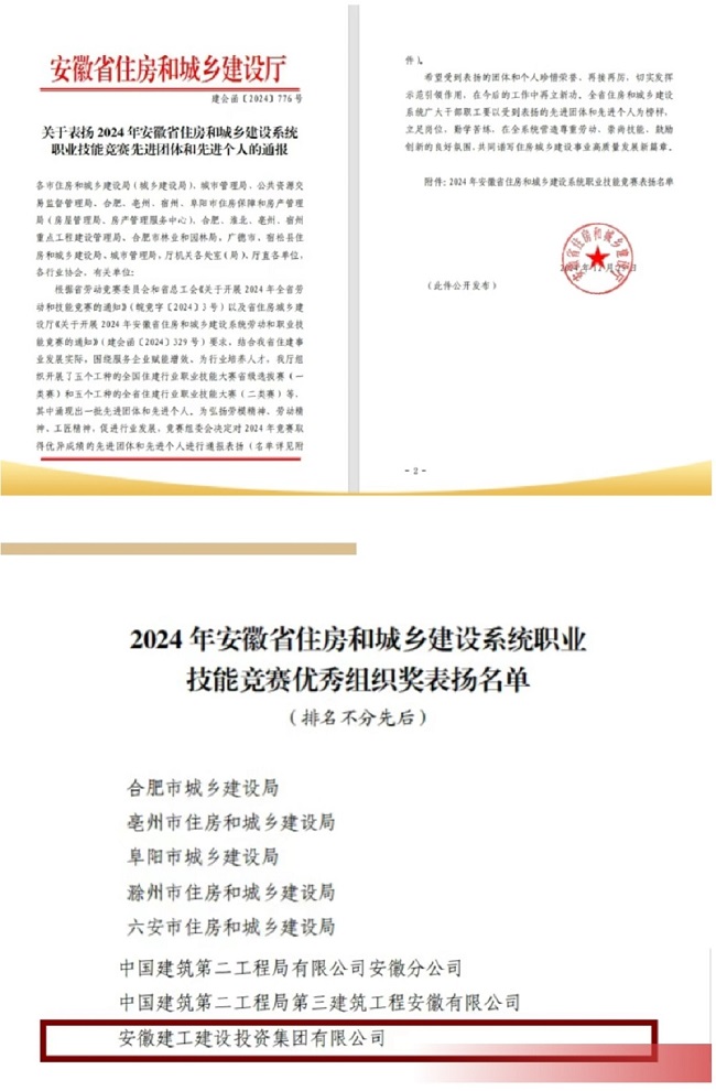 近日,安徽省住房和城乡建设厅发布《关于表扬2024年安徽省住房和城乡建设系统职业技能竞赛先进团体和先进个人的通报》,对2024年竞赛取得优异成绩的先进团体和先进个人进行通报表扬。其中,建工建投集团喜获优秀组织奖!另4名员工喜获先进个人表扬。