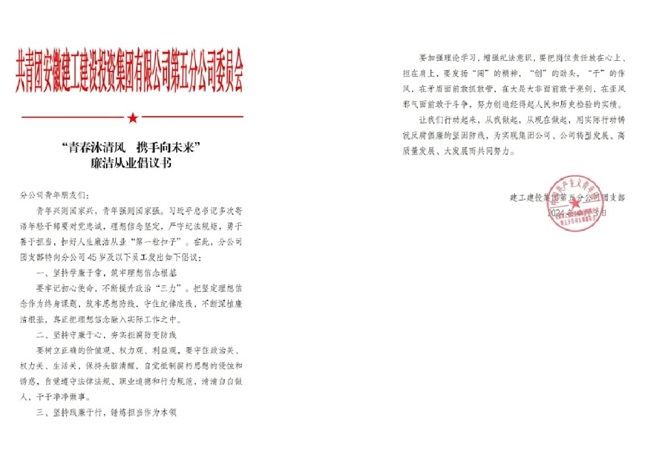 为进一步加强廉洁文化教育,分公司团支部发布“青春沐清风 携手向未来”廉洁从业倡议书,鼓励各项目立足自身,打造多形式、多渠道的廉洁文化宣传阵地。同时划区分片定人送廉洁文化、警示案例到项目部,以案促廉,促使分公司团青受警醒、知敬畏、懂规矩、守纪律、明底线、慎言行、作表率。
