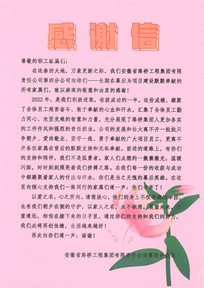 本次活动从策划方案、选购慰问品、起草慰问信等,每一个小细节都满载着四分公司党政工团对员工及家属的厚爱和感激之情。下阶段,四分公司将持续聚焦项目职工所需所盼,把职工冷暖放在心里,以传递关怀、情暖后方的实际行动,解职工忧、暖职工心,全力做好项目职工的后方保障工作,让项目职工切实感受到分公司的关怀和重视,踔厉奋发,勇毅前行,为助力公司高质量发展汇聚奋进力量。