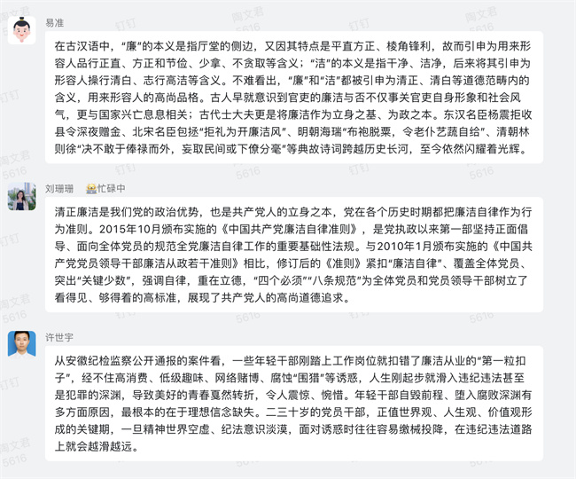 线上,分公司团青们围绕“廉洁担当”主题,立足个人岗位职责,结合工作经历,分享交流对廉洁的认识和自勉。同时,分公司团支部发布《致分公司广大团青的廉洁倡议书》,以青春的名义,扬廉洁之风气,号召分公司广大团青系好“青”廉扣,争做清廉人。