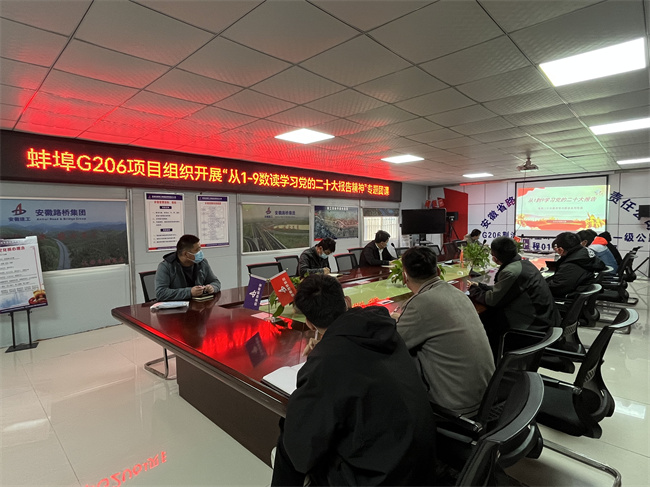 蚌埠G206项目组织开展“从1-9数读学习党的二十大报告精神”专题团课,围绕“一个中心任务”、“两步走”、“三个务必”等9个方面关键词进行了详细解读,在逐条逐段推敲中深刻领悟党的二十大的精神实质。