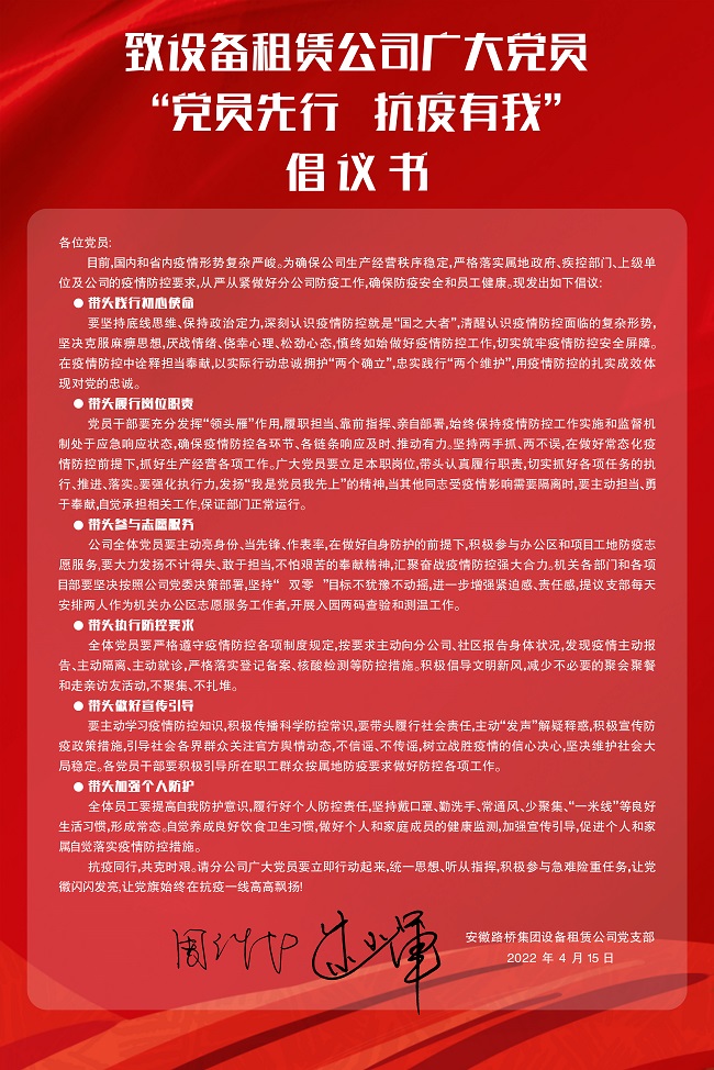 4月18日, 设备租赁公司分公司党支部发出《“党员先行 抗疫有我”倡议书》,号召全体员工特别是党员干部坚决贯彻习近平总书记重要指示精神,按照建工控股党委和公司党委部署要求,充分发挥党员干部的主体作用,为打赢这场疫情防控攻坚战贡献自己的智慧和力量。
