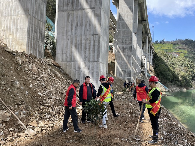 在黄千02标项目武阳互通桥墩旁,陡峭且修整平齐的边坡处,众多志愿者们穿梭其中的身影,他们热情澎湃、激情昂扬,在料峭春风的相伴下,拿起手中的铲子挖起一个个树坑,埋下了一棵棵名为“希望、未来”的树苗,并为树苗浇灌春天的甘泉,植树志愿活动如火如荼的进行,志愿者们不怕累不怕脏,两边昂扬的树苗见证了他们辛劳汗水的抛洒,只为实现路桥集团人心中最初的承诺“来时绿水青山,走时青山绿水”!