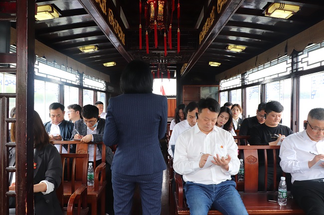 碧波荡漾的嘉兴南湖上,一艘红色画舫见证了一个标志着近代以来中国命运彻底改变的历史时刻。4月25日上午,一分公司党总支一行人来到中国革命的扬帆启航地嘉兴南湖,追寻革命原点。一分公司党员同志、入党积极分子首先在南湖小船上开展中共一大党史学习专题党课。党课从中共一大召开的背景、过程、意义、会议参与者,以及建党节纪念日的由来等方面娓娓道来,分公司党总支一行人仔细听讲,认真记录。随后,分公司党总支一行人在南湖边瞻仰红船,接受革命精神教育,感悟红船精神中开天辟地、敢为人先的首创精神,坚定理想、百折不挠的奋斗精神,立党为公、忠诚为民的奉献精神。