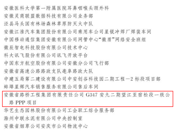 4月27日,2023年庆祝“五一”国际劳动节暨全国五一劳动奖和全国工人先锋号表彰大会在北京人民大会堂举行。207个集体和1035名个人分获全国五一劳动奖状、奖章,1044个集体获全国工人先锋号。由安徽建工建设投资集团承建的G347安九二期PPP项目被中华全国总工会授予“全国工人先锋号”荣誉称号。