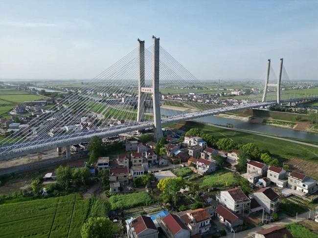 项目控制性工程杨湾河特大桥(望江大桥)全长1322米,主跨365米,由685米双塔预应力混凝土斜拉桥与637米东西引桥组成,主塔塔高110米,是安徽省在建同类预应力钢筋混凝土斜拉桥第二大跨径桥梁,也是安徽建工集团目前承接单跨跨径最大的桥梁工程。