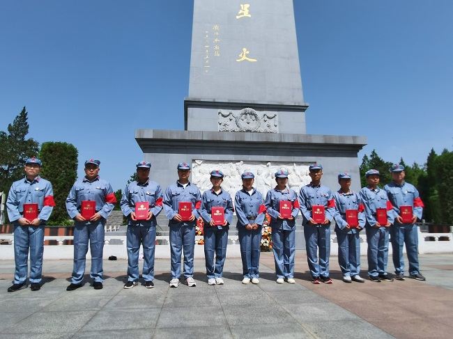 在统一换上红军服装后,青年团员们首先来到金寨红军文化广场。在革命烈士纪念塔下,面对鲜艳的中国共产主义青年团团旗,公司团委书记带领到场青年团员重温入团誓词,牢记初心使命,缅怀革命先烈,传承五四精神,并对荣获公司2020年度“五四红旗团支部”与“优秀团员”的集体与个人进行了表彰。