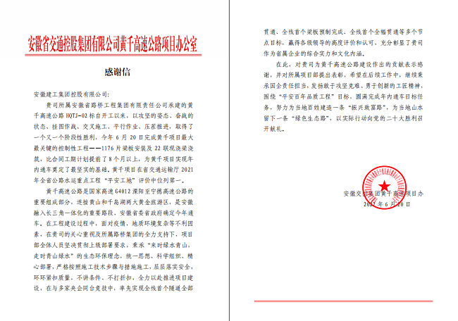 感谢信指出,安徽路桥集团黄千高速02标项目自开工以来,面对疫情、地质环境复杂等不利因素,秉承“来时绿水青山,走时青山绿水”的生态环保理念,统一思想、科学组织、精心部署,严格按照施工技术步骤与措施施工,层层落实安全,环环紧扣质量,不讲条件、不打折扣,全力以赴推进项目建设,在与多家央企同台竞技中,率先实现全线首个隧道全部贯通、全线首个梁板预制完成、全线首个全幅贯通等多个节点目标,赢得各级领导的高度评价和认可,充分彰显了公司作为省属企业的综合实力和文化内涵。