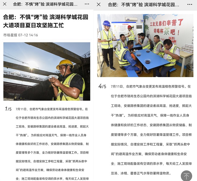 《安徽日报》《市场星报》及其所属新媒体平台将摄影镜头对准路桥集团项目生产一线,看建设者不惧“烤”验、奋战一线,看项目部多措并举、降温有方。