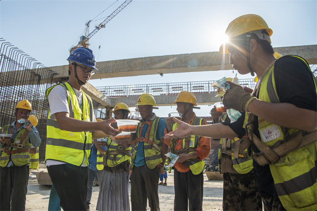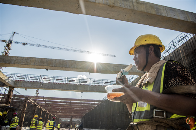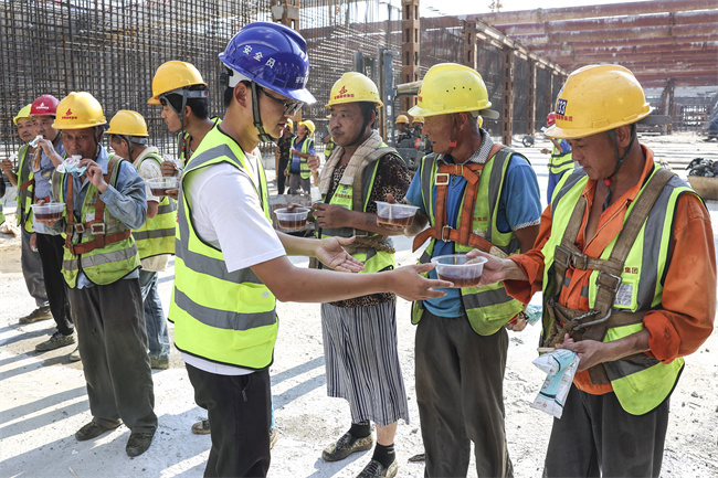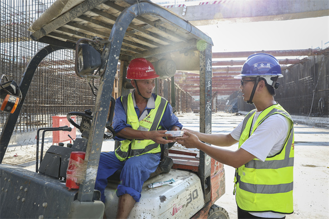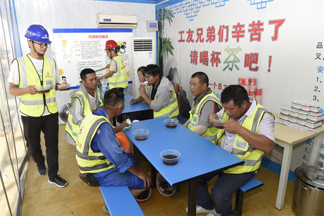 多措并举,降温有方。为积极应对高温天气,保障一线作业人员身体健康和良好的工作状态,安徽路桥集团从物资储备、制度管理等多个方面,全力做好防暑降温管理工作。项目根据实际情况,合理安排工序和工程量,采取“抓两头歇中间”的避高温作业方案,确保劳动者身体健康和生命安全;施工现场配备装有空调的茶水亭,每天给工人发放绿豆汤、冰棍、藿香正气水等防暑降温物资,避免中暑事件发生。
