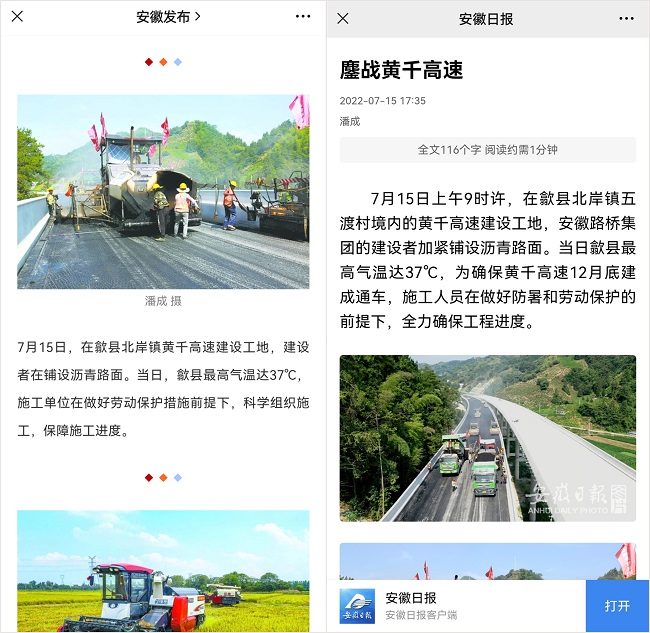 近日,“安徽发布”官方微信号、《安徽新闻联播》栏目及其官方微信公众号、《安徽日报》新媒体客户端为题,对安徽路桥集团黄千高速建设者烈日下的施工情况与防暑降温举措进行重点报道。