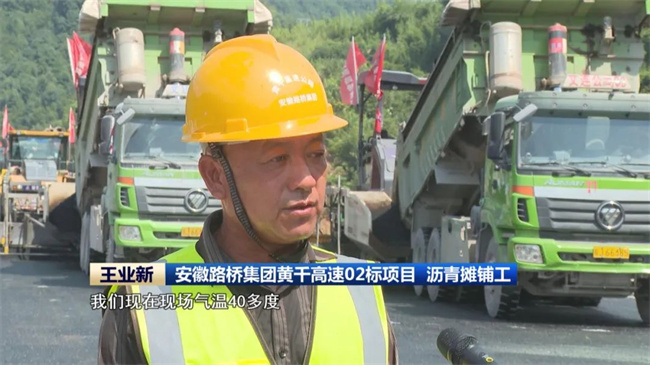 在黄山至千岛湖高速安徽段施工现场,沥青摊铺工王业新和工友正跟随作业机械对路面进行细节调整和人工填料。因为沥青摊铺的特殊性,越是温度高,铺设效果越好,而且需要不间断施工,所以王业新他们有时中午时分仍然坚守在岗位上。