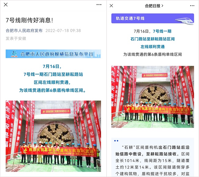 7月16日上午,随着“拼搏号”盾构机刀盘缓缓破土而出,由安徽路桥集团承建的合肥轨道交通7号线石门路站至耕耘路站区间左线贯通,为该线贯通的第6条盾构单线区间。