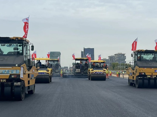 自2022年8月中旬以来,项目部统筹谋划,紧抓主线桥梁桥面系、挡墙段路基填筑、路侧石改造等前置施工建设,同步推进路面原材料准备、配合比验证等相关准备工作,于2022年9月24日,顺利启动了K598+700-K599+040下面层沥青试验段工作,较计划工期提前15天。目前,项目已全面进入主线路面施工,向着12月底主线贯通目标发起冲刺。
