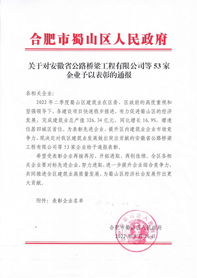 9月26日,合肥市蜀山区人民政府发来表彰通报,对公司二季度所属各项目快速稳步推进工程建设,有力促进区域经济发展,提升区内建筑业企业市场竞争力所做出的突出贡献给予高度赞扬。